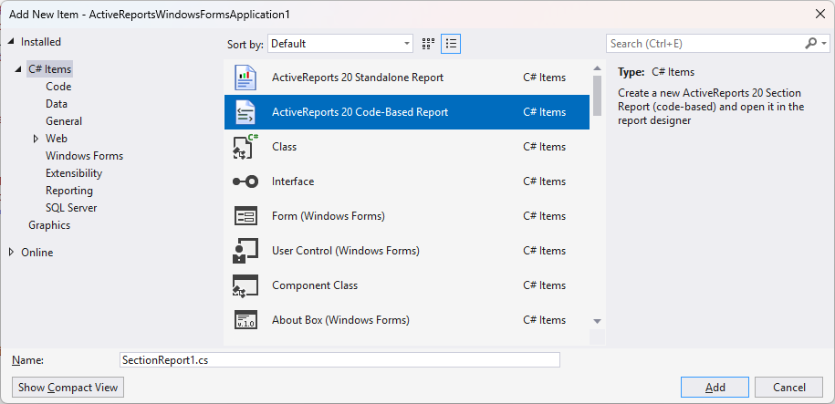 Select ActiveReports 20 Code-Based Report and click Add.