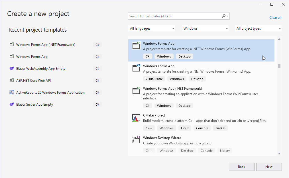 In the list of project templates, find and select Windows Forms App. Click Next to continue.