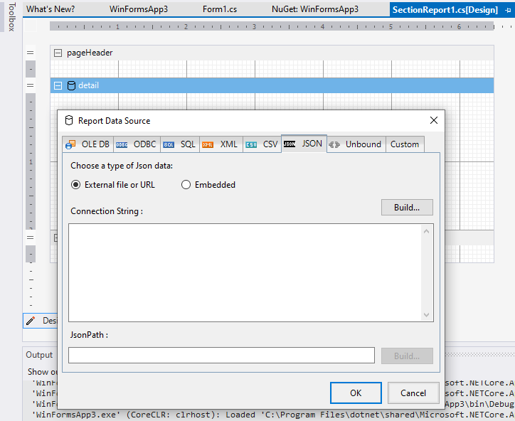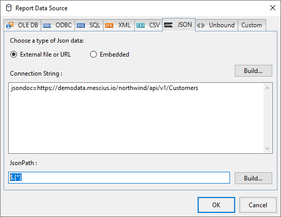 In the Report Data Source dialog, select the JSON tab and click the Build... button.