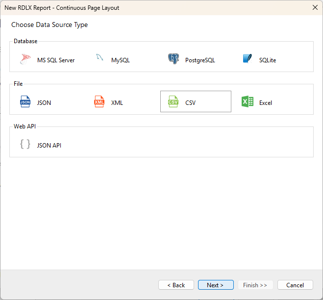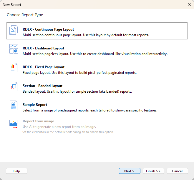 In the New Report wizard, choose the Report Type as RDLX - Continuous Page Layout and click Next >.
