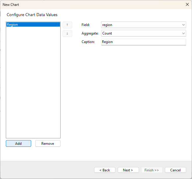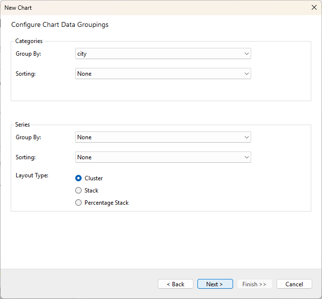 Configure chart data in the Configure Chart Data Values screen and click Next >. See Create Clustered Column Chart tutorial to visualize the data in a stacked column chart.