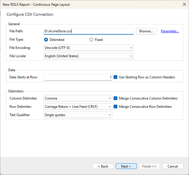 On the Configure CSV Connection screen, specify the File Path by clicking the Browse button and navigating to the desired folder on your system. Let us bind data to the AcmeStore.csv file. See CSV topic for more information.