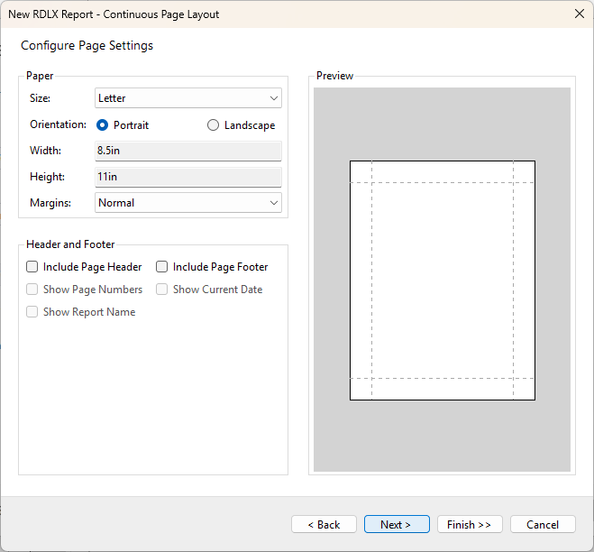 In the Configure Page Settings screen that appears, adjust the report page settings and click Next >.