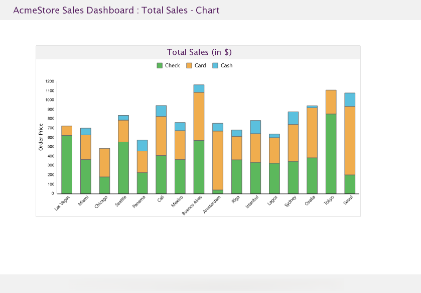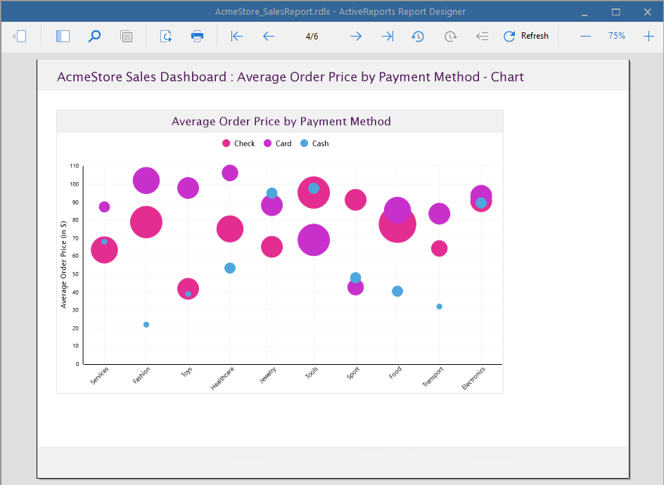 In this section, drag-drop a Chart data region to plot the average order price by payment method using a Bubble chart. See Create Bubble Chart tutorial to visualize the data in a bubble chart.