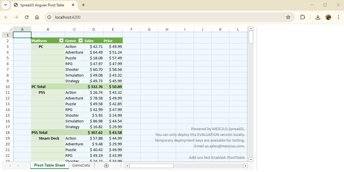 Pivot Tables are essential for summarizing, grouping, and analyzing large data sets in a visual and interactive way. In this tutorial, we'll show how to embed a Pivot Table into your Angular application using the Angular Spreadsheet component, SpreadJS, and its optional Pivot Table add-on. Instead of generic sample data, we'll use real-world-like mock data of video games, including title, genre, platform, price, ratings, and more.