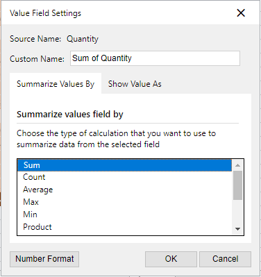 Users can also format values with given or customized formats by choosing the "Value Field Settings..." option from the data area or the Grand Total area context menu to open the dialog window.