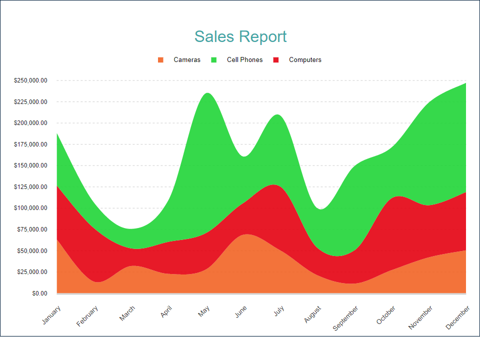 Like line charts but with shaded areas under the lines, these charts emphasize volume and are suitable for showing cumulative trends.