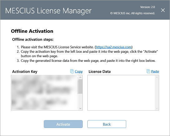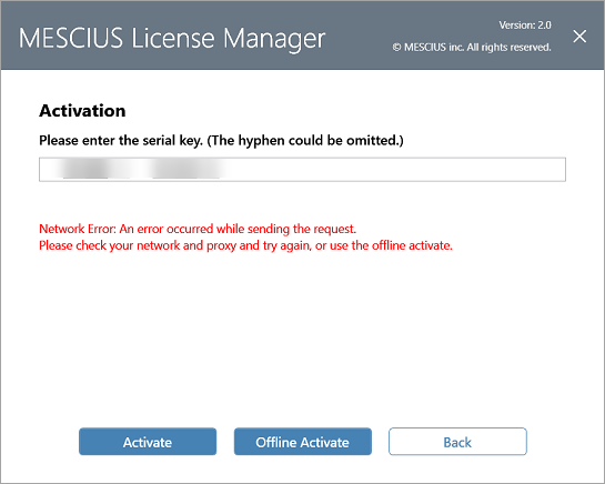 When the MESCIUS License Manager fails to activate a serial key due to network issues, you can activate your serial key offline by clicking the Offline Activate button.