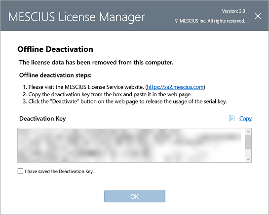 When the MESCIUS License Manager fails to deactivate a serial key due to network issues, you can deactivate your serial key offline by clicking the Offline Deactivate button.