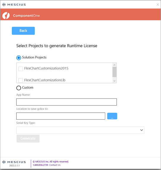 On selecting Custom option, you can provide the App Name manually for which the license needs to be generated and the location where gclix file needs to save. Also select the type of license in the Serial Key Type dropdown. On clicking the Generate button, a success message appears and a license file <ProjectName>.gclicx is generated