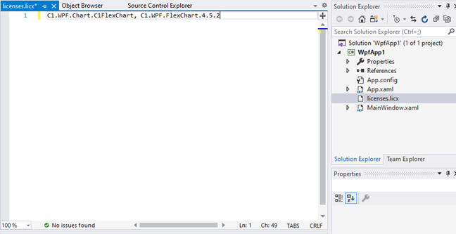All ComponentOne controls, VisualStudio, and the assembly on your machine all work together through a file called licenses.licx. If you're new to using third party controls, you may have never seen this file in your life. If you're working on a pre-existing project, it may be available in the Solution Explorer underneath the Project Name > Properties > licenses.licx. However, if it is not available in your project, you can add it yourself by following these steps: