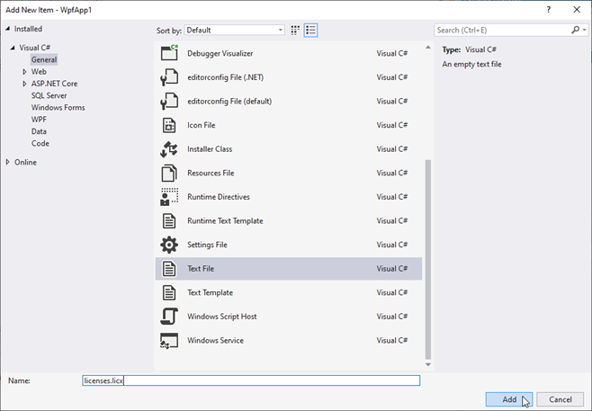In the Add New Item window, select Text File to create a new text file and name it licenses.licx (make sure there isn’t a txt extension).