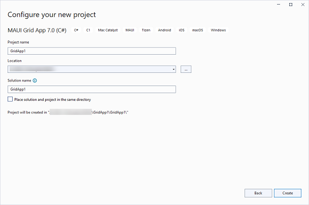 - In the Configure your new project window, provide name of the project you want to create in the Project name field, say Maui_App, and location for the project in the Location field. We have kept the default Project name, GridApp1. Then, click Create.