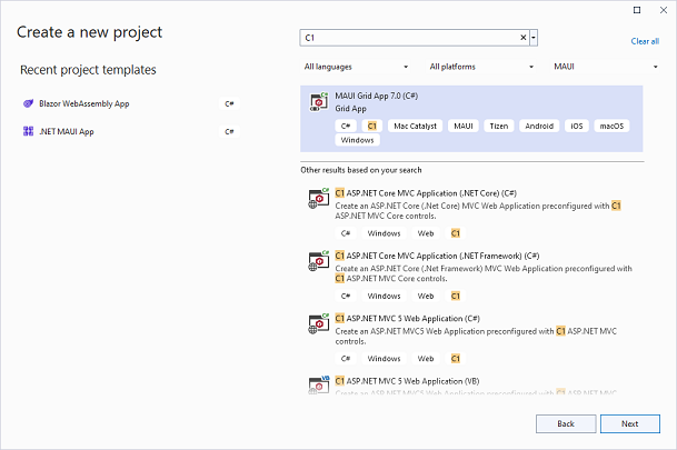 - In the Create a new project window, type C1 in the search bar to get the list of all the installed C1 templates and select MAUI from the project drop-down.
