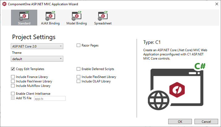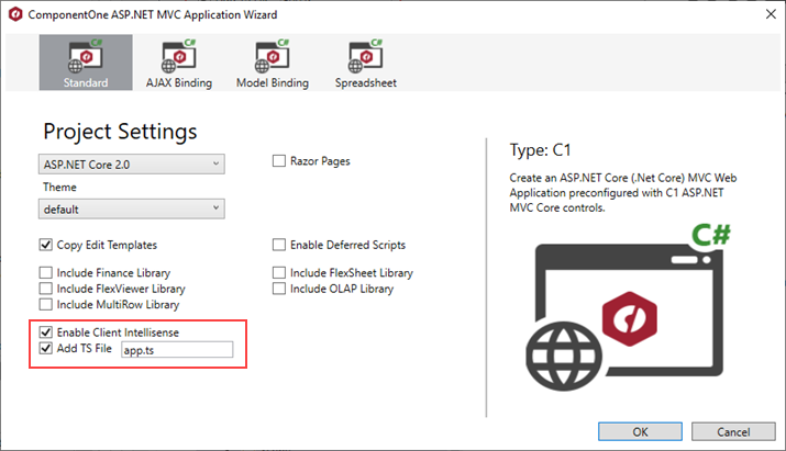 In case, you want to work only with the client side code in TypeScript, select the Enable Client IntelliSense and Add TS file check boxes from the ComponentOne ASP.NET MVC Application Wizard.