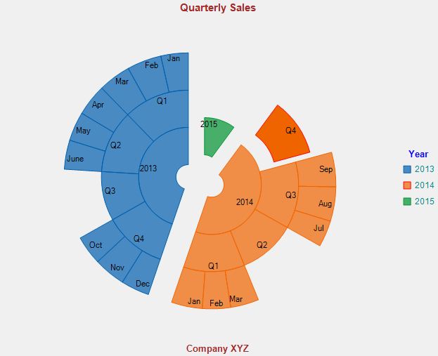 Sunburst chart is used to display hierarchical data, represented using concentric circles. The circle in the center represents the root node, with the data moving outside from the center. A section of the inner circle supports a hierarchical relationship to those sections of the outer circle which lie within the angular area of the parent section. Sunburst chart can be effectively used in scenarios where you want to display hierarchical data, represented using relationship between outer rings and inner rings.
