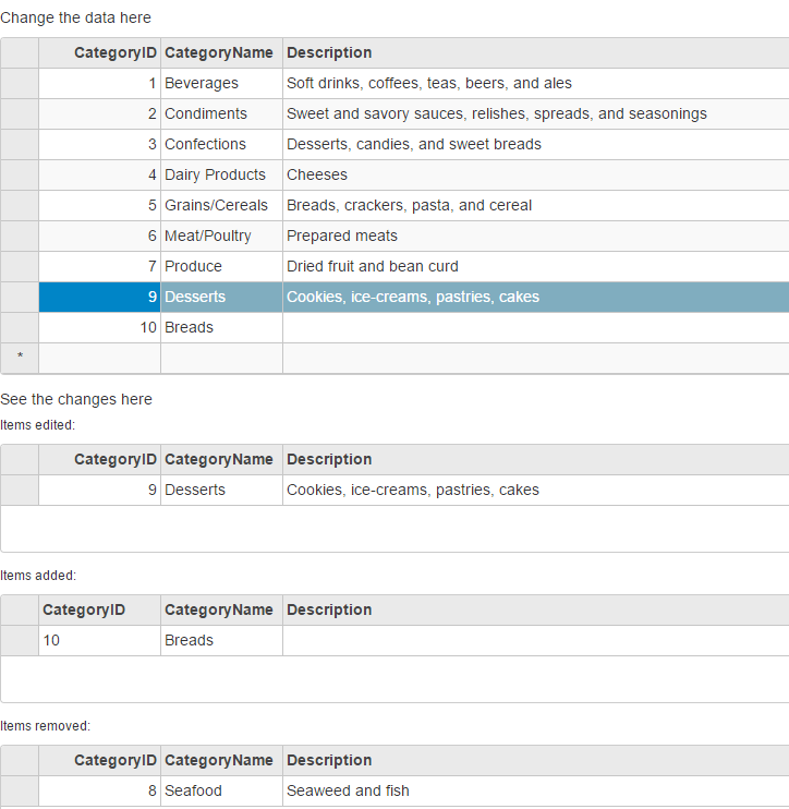 The CollectionView class can keep track of changes made to the data. It is useful in situations where you must submit changes to the server. To turn on change tracking, set the TrackChanges property to true. Once you do that, the CollectionView starts tracking the changes made to the data and exposes them using the following: