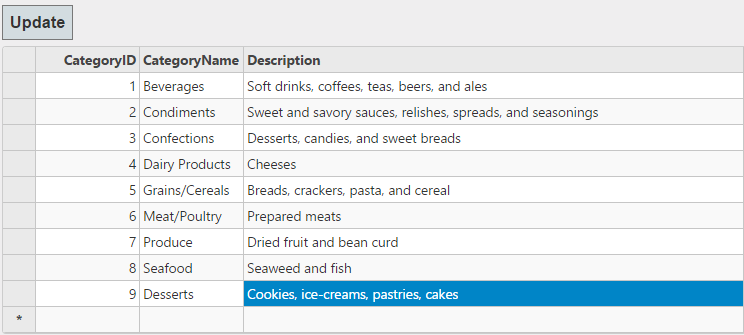 The following image shows how the FlexGrid appears after setting the BatchEditing request of CollectionViewHelper. A user can commit changes to the server by clicking the Update button.