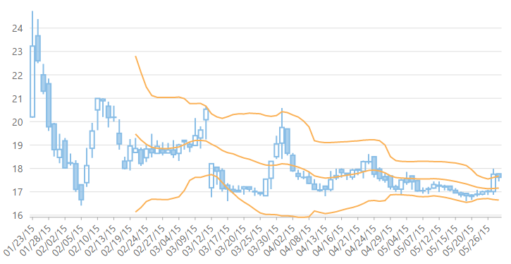 The following code example demonstrates how to add Bollinger Bands overlay to the FinancialChart. This example uses data from BoxData.cs model, and box.json file.