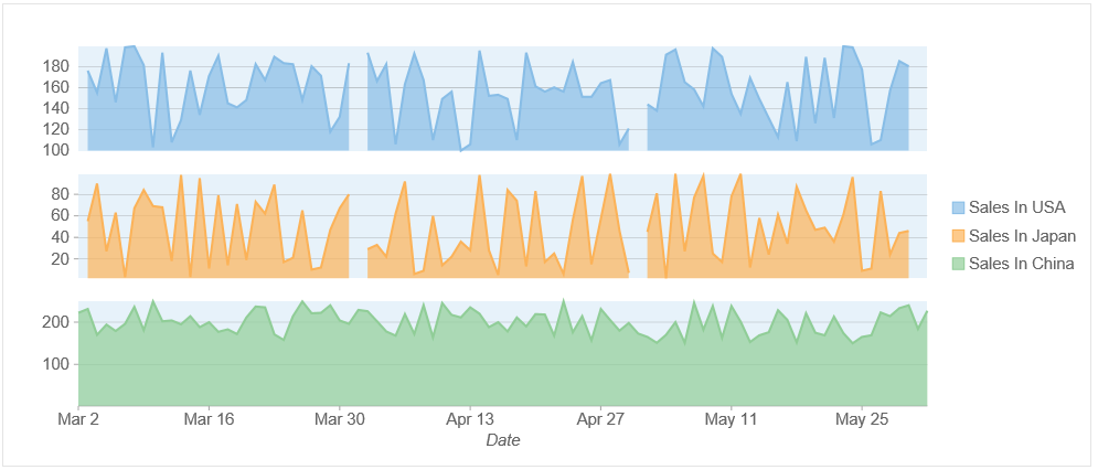 In FlexChart, you can create different plot areas for different series within a single chart area. This increases the viewability of data by displaying each series in a separate plot area across one axis, keeping other axis fixed.