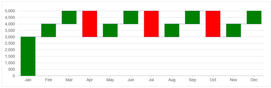 Waterfall series is a form of data visualization that helps in understanding the progressive effect of positive and negative values in FlexChart. Waterfall series can be used for analytical purposes, mainly for understanding or explaining the continuous transition in the value, which is subjected to increase or decrease.