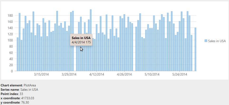The following image shows how labels below the chart display the X, Y coordinate values and the index of the hit point on FlexChart.