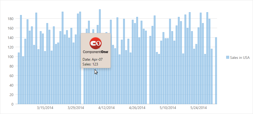By default, a tooltip generally displays the name of the legend along with the X and Y values of the selected point. FlexChart allows you to display customized tooltips that may contain labels or images by setting the [Content](/componentone/api/mvc/online-mvc-core/dotnet-api/C1.AspNetCore.Mvc/C1.Web.Mvc.ChartTooltip.Content.html)