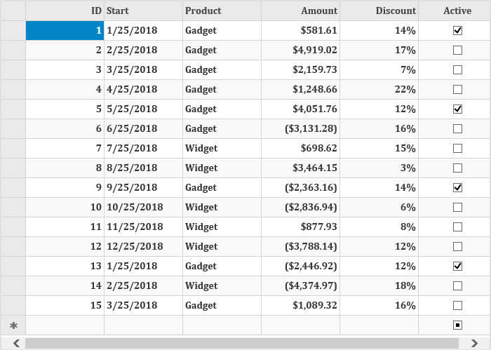 The quick start guides you through the steps of adding the FlexGrid control to your MVC application and populate data in it. The following example demonstrates local model binding in FlexGrid control. For detailed explanation on how to do remote binding in FlexGrid, see Remote Data Binding topic.