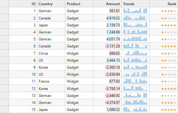 The following image shows how the FlexGrid appears on setting FlexChart as a cell template to represent Trends, and Stars as another template for representing Rank. The example uses Sale.cs model added in the QuickStart section.