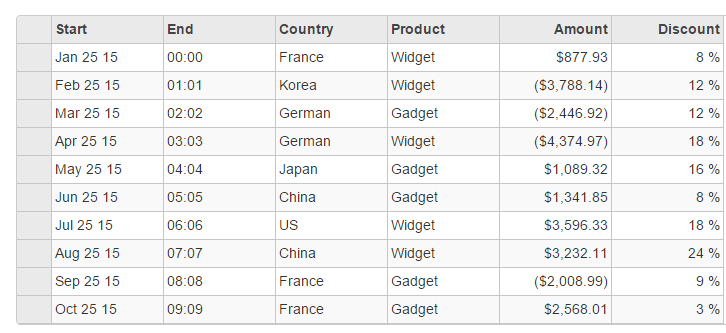 The following image shows how the FlexGrid appears after making the C1JSON Request to fetch data from the model, Sale.cs, which was added to the application in the QuickStart: