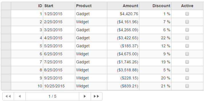 The following image shows how the FlexGrid appears after setting the PageSize property. The example uses Sale.cs model, which was added to the application in the Quick Start:
