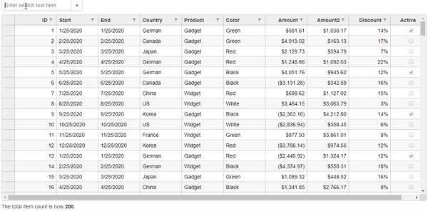 The following example shows the use of FlexGridSearch control to search the items in FlexGrid. The example uses Sale.cs model added in the QuickStart. The grid updates dynamically as you enter text and highlights any full or partial matches according to the text you enter.