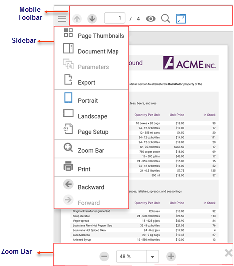 MobileViewer for ASP.NET MVC Edition helps you to view and render your reports on any hand held device. There are different navigation tools available in the MobileViewer which helps the user to easily navigate and work with the report. Once you preview the report in MobileViewer, you can use the options in the side menu while working with the report. This topic will help you understand the different navigation tools available on the MobileViewer.