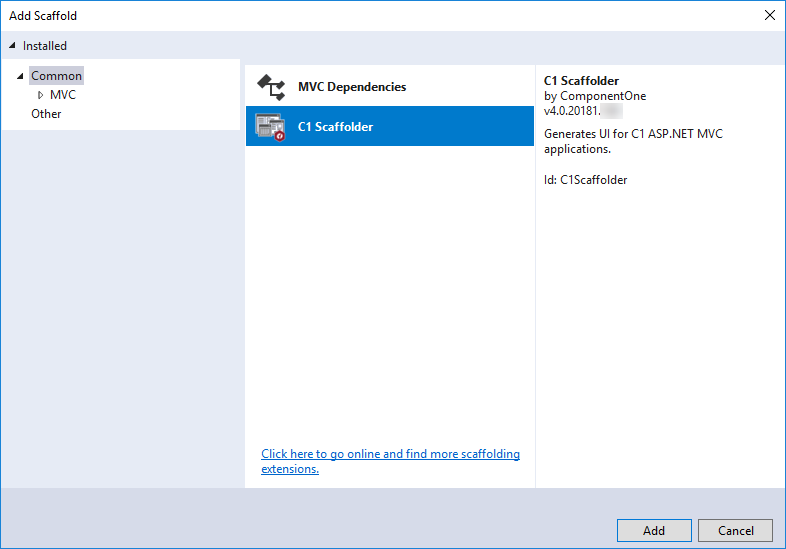 In the Add Scaffold wizard, select Common and then select C1 Scaffolder from the right pane. You can also select Common|MVC|Controller or Common|MVC|View and then C1 Scaffolder to add only a controller or a view.