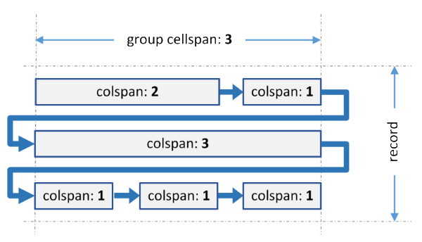 The group spans three grid columns and contains six cells with different spans. When generating the layout, the grid fits as many cells as possible in each row, and wraps to the next row when the group span is reached. The last cell in each row is automatically expanded to fill colspan of the group. The process is similar to wrapping of text to create a paragraph. The same process is applied to every group in the layoutDefinition object.