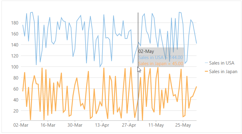 The image below shows vertical line marker with marker content to display the value of data points on the FlexChart.