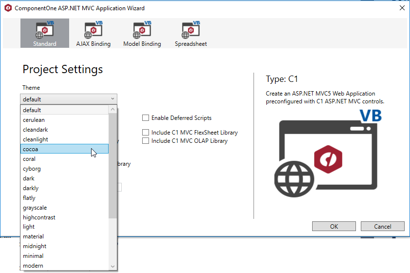 Using ComponentOne Template - You can use the ComponentOne ASP.NET MVC Application Wizard to set a theme to your application using the Theme option. In the image below, you can see the list of themes that are available for ASP.NET MVC application.