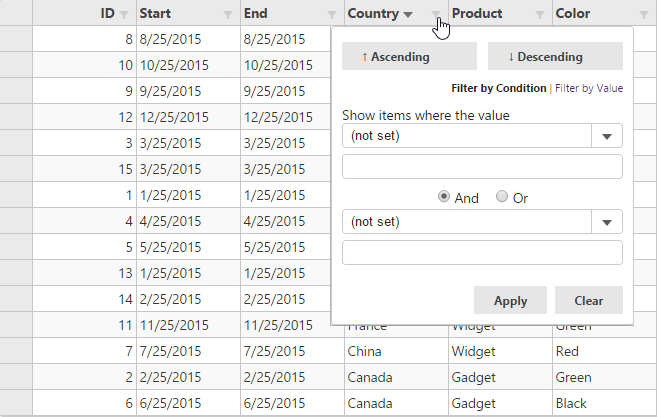 The following image shows how the FlexGrid appears on applying Filter by Condition.