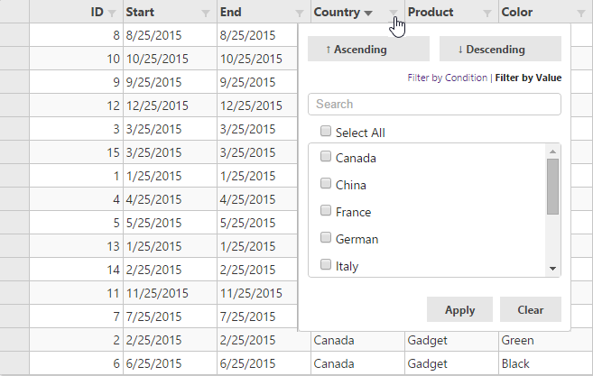 The following image shows how the FlexGrid appears after applying Filter by Value to different columns. The example uses Sale.cs model added in the Quick Start section. Here, you create filters for different columns in the grid, and specify conditions or provide exact values to refine your search. Click Apply to fetch the filtered values.