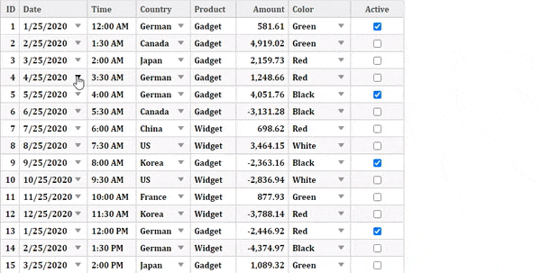 The following example demonstrates how you can use MVC InputDate, InputTime, ComboBox, InputNumber, and InputColor controls as custom editors. To use an input control as a custom editor, all you have to do is associate an instance of the control with a grid column or a style using its Editor property. This example also showcases how CellTemplate can be used for customizing the editors further in some of the columns.