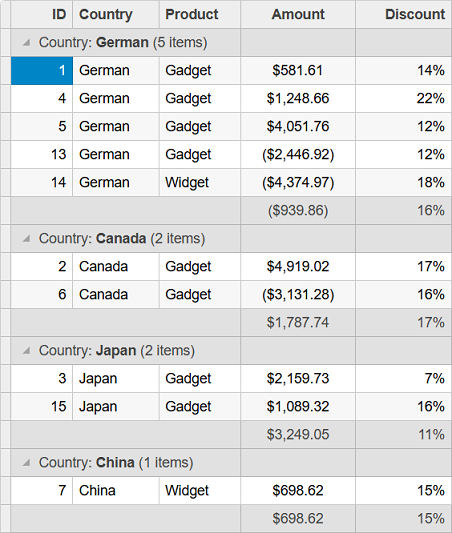 The following image showcases how the group rows contain the sum of the 'Amount' and the average of 'Discount' columns for each group.