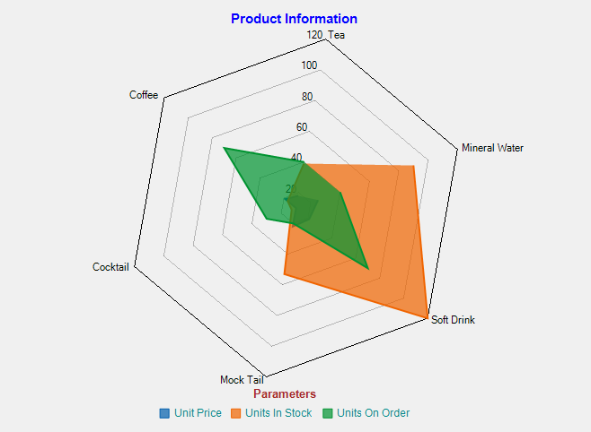 Common business applications of FlexRadar can include skill analysis of employees and product comparison. It is important to note that the FlexRadar control represents a polar chart when X values are numbers that specify angular values in degrees.