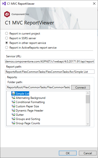 In the Service URL field, enter a Web API Service URL to access the reports. For example, https://demos.componentone.com/ASPNET/c1webapi/4.0.20171.91/api/report.
