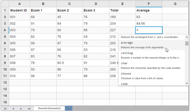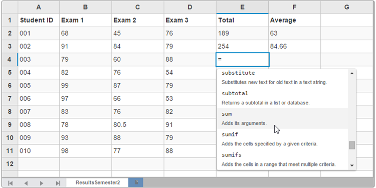 For example, the following image shows FlexSheet control displaying scores (out of 100) of 10 engineering students of a batch in three semester examinations. The examples below demonstrate how to use formulas to calculate sum and averages of their scores.