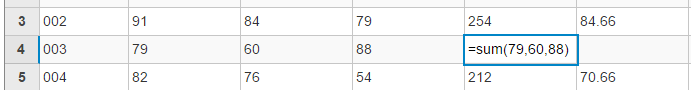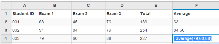Similarly, below we average the scores of Student ID 003 in the cell F4.