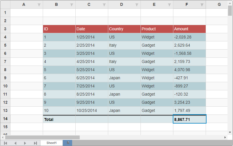 In the FlexSheet control, you can easily turn a range of cells into a table with data source. To add tables in the FlexSheet control, firstly, you need to add an unbound sheet, and then use its instance to access the Tables method, which allows you to add a table in your FlexSheet. To populate data and setting up the table, you need to set some basic methods, such as Name, Range, and Bind provided by the TableBuilder class. The columns are auto generated in the Table. However, in case you want to specify the columns in a different order or specify limited number of columns, you can use the Add method. Apart from this, you can also apply styles to the table with the help of TableStyle class.