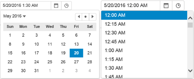 The InputDateTime control allows users to enter date and time using any format which is supported by the Globalize class. It also allows the users to pick a date from the drop-down box that displays a calendar and pick a time from the drop-down list. You can define the range of values a user can enter by setting the Min and Max properties of the control. The InputDateTime control also allows you to change individual date and time components (day, month, year, hour, minutes and seconds) independently by pressing up or down keys on the keyboard or using the mouse wheel.