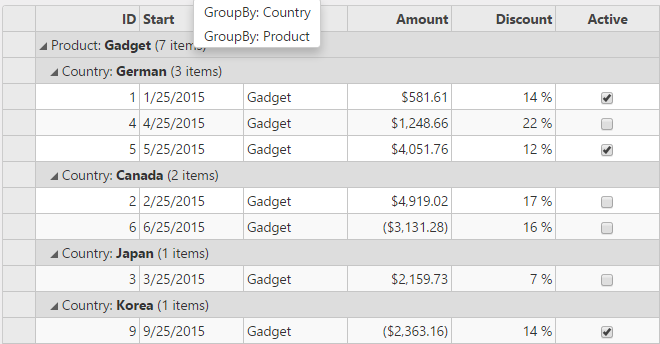 In this example, Menu is used as a context menu to enable grouping in the FlexGrid control. Two fields, GroupBy: Country and GroupBy: Product are added in Menu to group FlexGrid's data by column Country and Product. A user can select an item from the context menu by right-clicking within the grid.