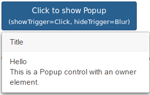 The Popup control enables you to add small overlays of arbitrary content to your applications, as popovers or modal dialogs. Popovers are the popups which have owner elements to control their visibility, and are placed relative to these owner elements when they appear on the screen. Whereas, dialogs are the popups with no owner elements, and they appear towards the center of the screen distinguished from the rest of the content on the screen.