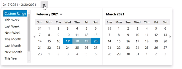 InputDateRange lets you to predefine date ranges based on your requirements. Using the InputDateRange control, you can define various date ranges, such as current week, last week, next month, this year range, custom ranges, etc., in your applications for users to choose from. You can use the PredefinedRanges property to define the day, week, month, year, or custom ranges in the InputDateRange control.